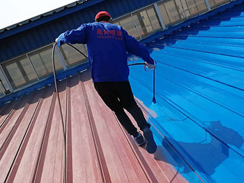 3、使用佳景美鐵紅防銹底漆在彩鋼屋面噴涂施工,用量0.15~0.2kg/m2;